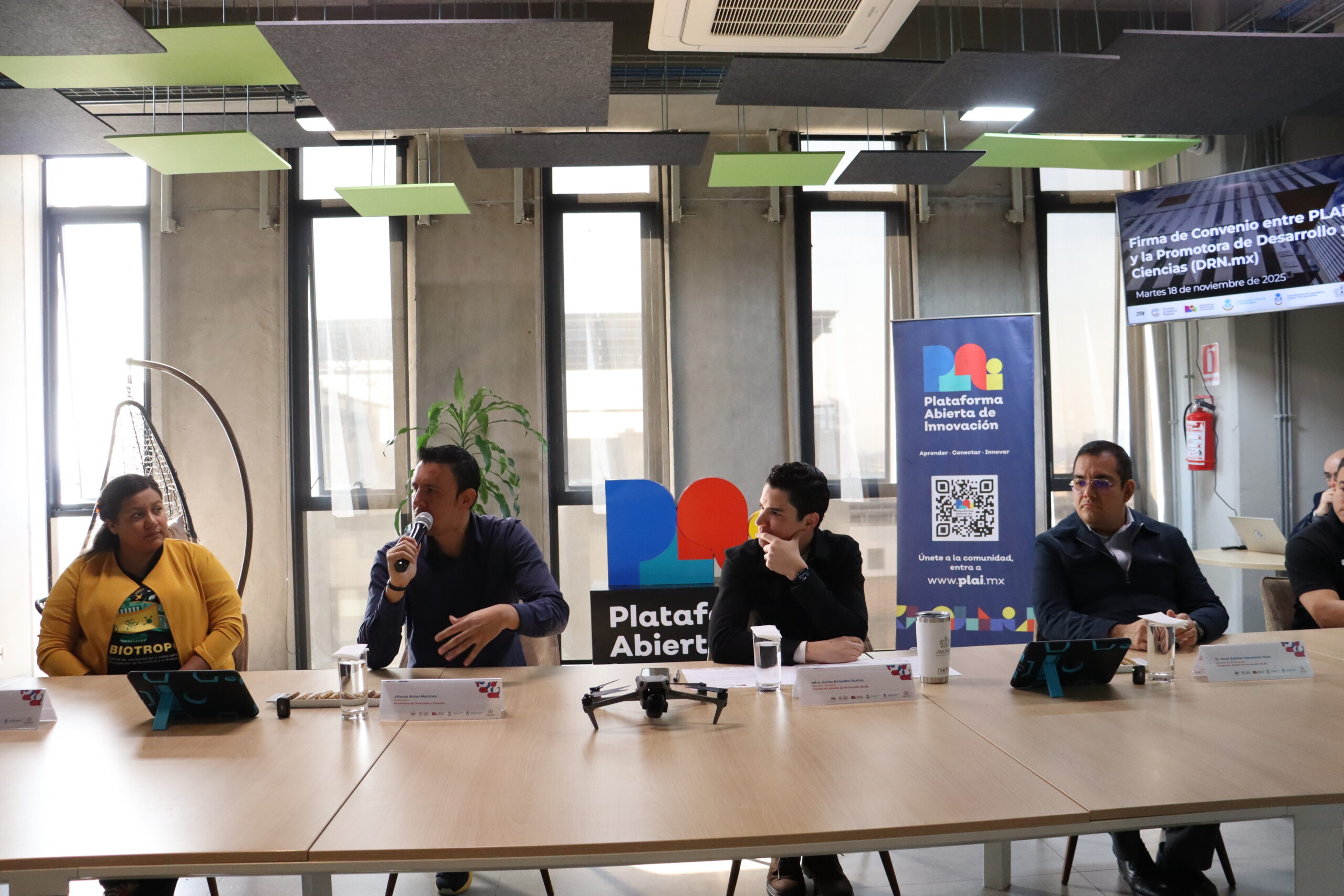 Con el objetivo de que Jalisco tenga su primer ecosistema de robótica aérea y drones, firmaron un convenio de colaboración la Plataforma Abierta de Innovación y la Promotora de Desarrollo y Ciencias, con ello, especialistas y emprendedores accederán a oportunidades reales en este campo, comenzando por el Drone Maker Space y programas para la operación, programación, mantenimiento y aplicaciones de drones, detalló el director general de PLAI, Carlos Bañuelos Barrios.