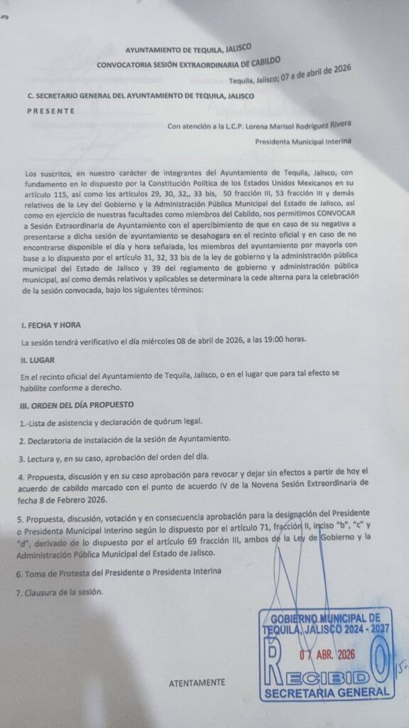 Habrá relevó en la presidencia municipal de Tequila, el pleno del Ayuntamiento sesionará este miércoles para dejar sin efectos el nombramiento de Lorena Marisol Rodríguez Rivera, como alcaldesa interina, y designar en el cargo a Fernando Contreras Salazar, actual sindico. Sería el segundo cambio al frente de la administración de Tequila tras la detención del presidente municipal electo Diego N.