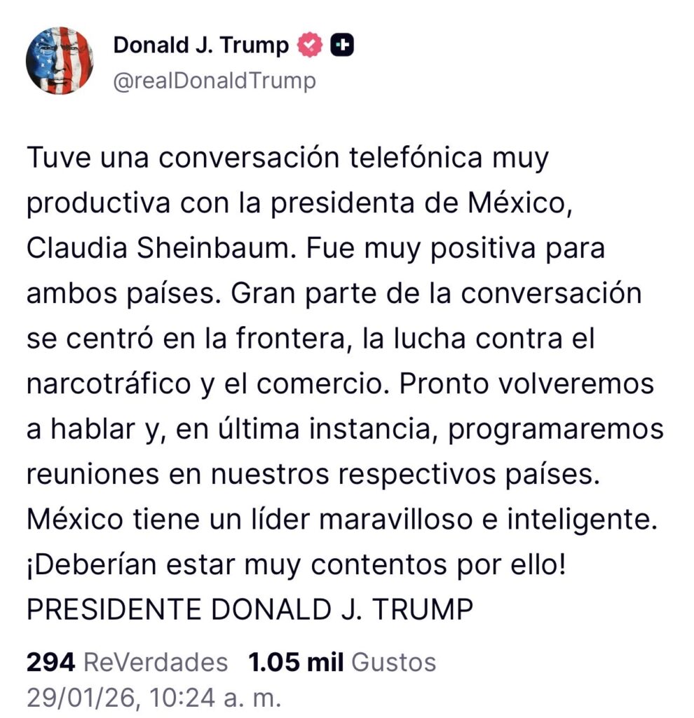 El expresidente de Estados Unidos, Donald Trump, informó que sostuvo una conversación telefónica productiva con la presidenta de México, Claudia Sheinbaum, la cual calificó como positiva para ambas naciones.